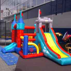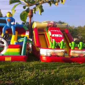 — Надувные батуты. Все батуты новые, интересные и необычные. Кроме обычных горок есть современные конструкции, где можно полазить, попрыгать и повеселиться. К вашим услугам батуты размером 3*5 м и 5*7 м.